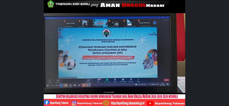 Kamis, 8 Desember 2022 Bapelitbang Tabanan diwakili Bidang PPM mengikuti kegiatan Bimbingan Teknis Kader Pembangunan Manusia dalam rangka Konvergensi Penurunan Stunting di Desa yang diselenggarakan oleh Kementerian Desa, Pembangunan Daerah tertinggal dan Transmigrasi secara daring lewat Zoom Meeting, diikuti oleh unsur DPMD, Bappeda/Bapelitbang dan Kader Pembangunan Manusia di Seluruh Indonesia secara serentak yang terbagi dalam kelas masing-masing Kabupaten/Kota.