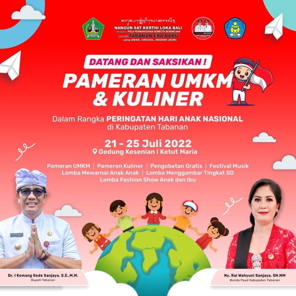 Ayo datang dan saksikan Pameran UMKM dan Kuliner dalam rangka Peringatan Hari Anak Nasional di Kabupaten Tabanan, tanggal 21 – 25 Juli 2022 bertempat di Gedung Kesenian I Ketut Maria, adapun beberapa kegiatan diantaranya :