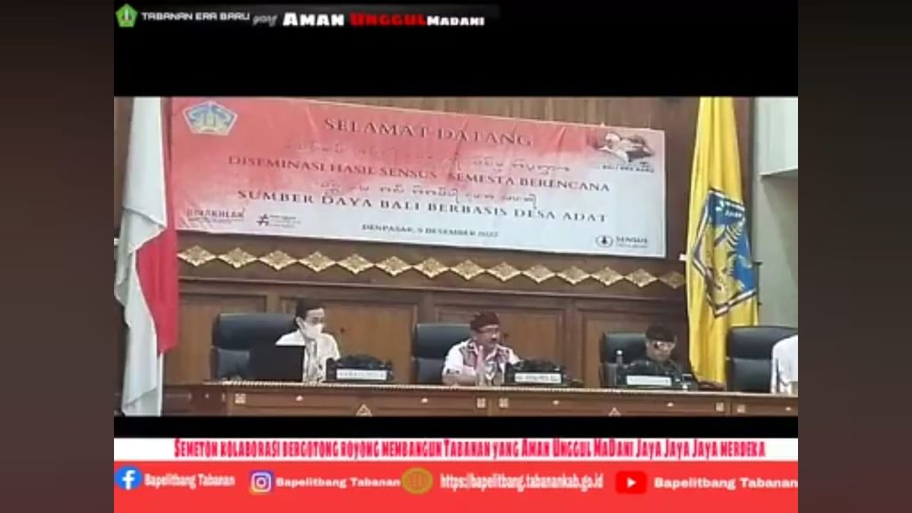Senin,5 Desember 2022 Bapelitbang Tabanan yang dieakili Bidang Litbang Menghadiri Rapat desiminasi sumber daya hasil sensus desa adat tahun 2022 dengan narasumber Dr. manik, ST,MT dan Prof.Dr. Darma Putra dalam membangun digitalisasi desa adat sesuai amanah RPJMD SEMESTA BETENCANA Provinsi Bali 2019-2023. Kabupaten Tabanan telah input dan verifikasi data 87,2 persen.