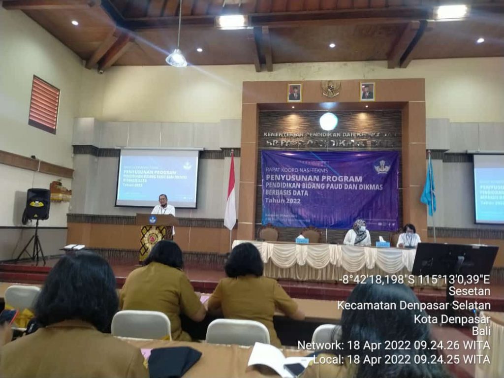Rapat koordinasi teknis penyusunan program pendidikan bidang PAUD dan Dikmas Berbasis Data Tahun 2022 diselenggarakan oleh BP PAUD dan Dikmas Provinsi Bali pada tanggal 18 April 2022 bertempat di BP PAUD dan Dikmas Provinsi Bali, Pegok Sesetan Denpasar. Acara diikuti oleh Unsur Bappeda dan Dinas Pendidikan Kabupaten/Kota se-Bali dibuka oleh Kepala BP PAUD dan Dikmas Provinsi Bali dengan narasumber Bapak Kepala Bappeda Provinsi Bali, Widyaprada dan salah satu kepala sekolah penggerak di Denpasar. Acara ini diselenggarakan bertujuan untuk membangun sinergitas antara pihak-pihak terkait dalam pemenuhan Standar Pelayanan Minimal (SPM) urusan pendidikan program PAUD dan Dikmas. Dalam kesempatan tersebut Bapak Kepala Bappeda Provinsi Bali berpesan agar Dinas Pendidikan dan Bappeda Kabupaten/Kota serta semua stakeholder terkait urusan pendidikan dapat bersinergi dan berkolaborasi dalam penyusunan perencanaan dengan menyediakan data yang valid sehingga SPM urusan pendidikan dapat terpenuhi sesuai dengan peraturan perundang-undangan yang berlaku.