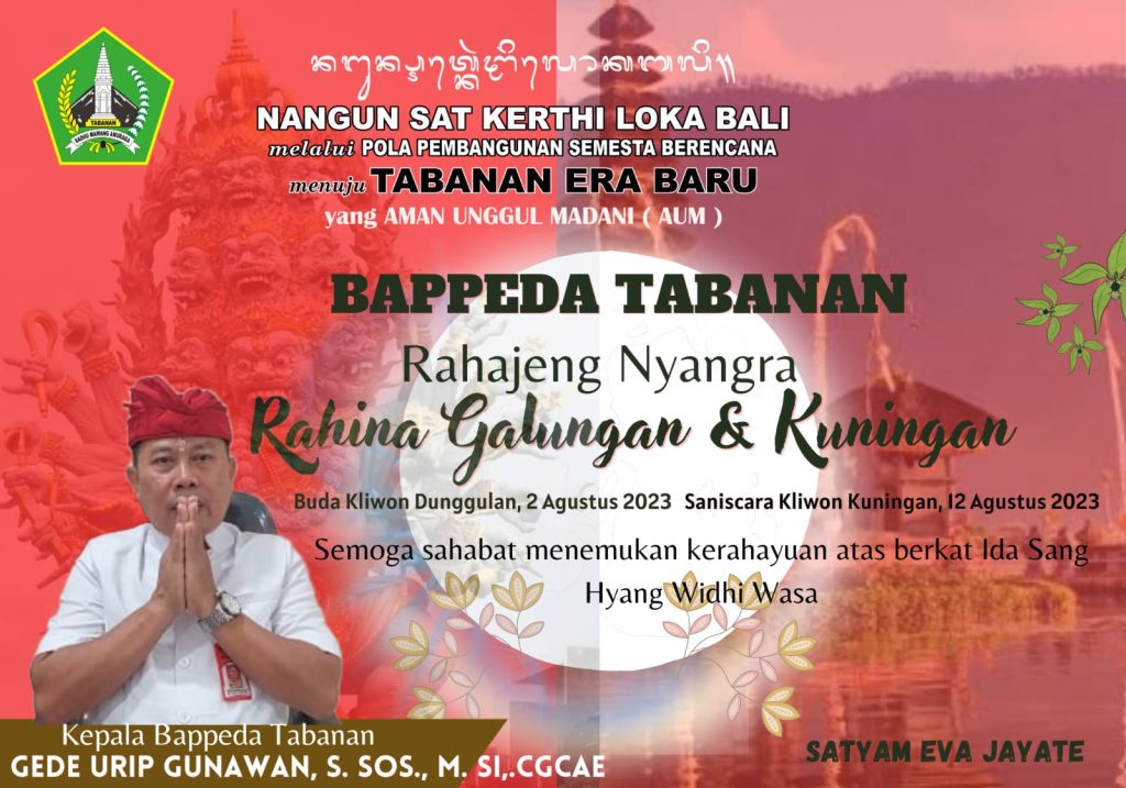 Berita Galeri Photo Selamat Hari Raya Galungan dan Kuningan Bappeda Tabanan 1 Agustus 2023 Bappeda Tabanan mengucapkan selamat hari raya Galungan dan Kuningan Continue Reading Previous Pembahasan Perubahan RKPD Tahun 2023Next Sosialisasi Indonesia’s Forestry and Other Land Use ( FOLU) Net Sink 2030 More Stories Berita Apel Disiplin Senin, 3 November 2025 Bappeda Tabanan 3 November 2025 Berita Selamat Hari Sumpah Pemuda Bappeda Tabanan 28 Oktober 2025 Berita Rapat Koordinasi Rencana Aksi Tindak Lanjut SPI Tahun 2024 Bappeda Tabanan 28 Oktober 2025 Berita SINKRONISASI PROGRAM DAN KEGIATAN KEMENTERIAN LPNK Bappeda Tabanan 28 Oktober 2025 Berita Bappeda Tabanan Nganyarin di Pura Semeru Agung Senduro Lumajang Jawa Timur Bappeda Tabanan 14 Juli 2025 Berita Apel Pagi, Senin 14 Juli 2025 Bappeda Tabanan 14 Juli 2025